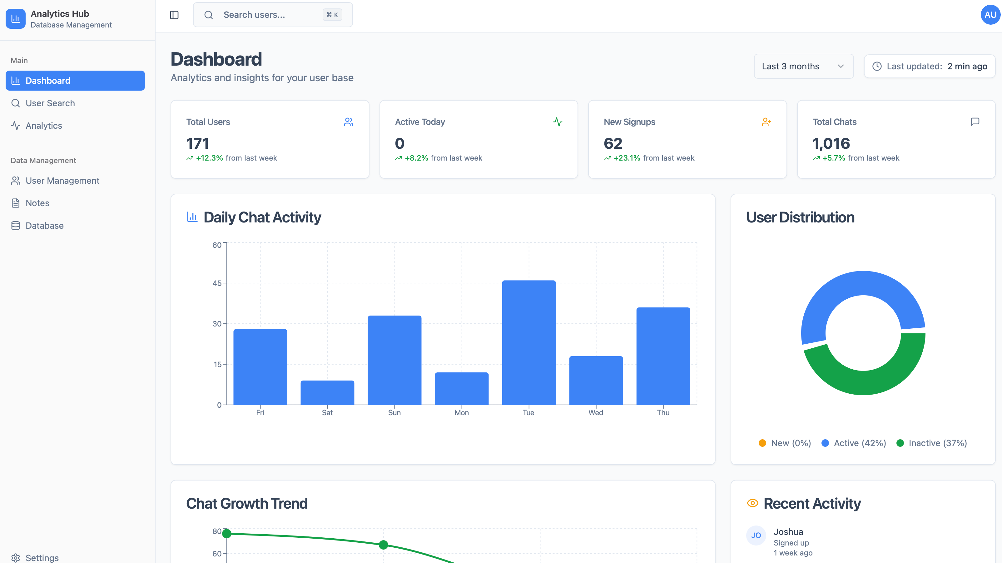 In roughly an hour, I had Lovable scaffold the dashboard, wire up auth, and render the first charts: total users, daily chat activity, new signups, user distribution, and recent activity. The starter UI was clean enough that I focused most of my time on queries and getting the numbers right.